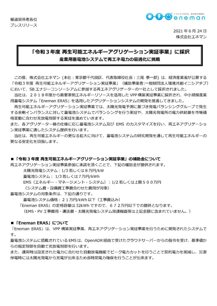 「令和3年度再生可能エネルギーアグリゲーション実証事業」に採択